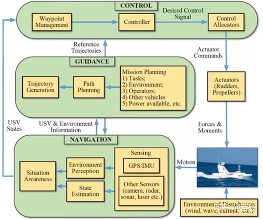 與自主航行直接相關(guān)的航行控制分系統(tǒng)又是無(wú)人系統(tǒng)的核心,它分為三個(gè)部分: